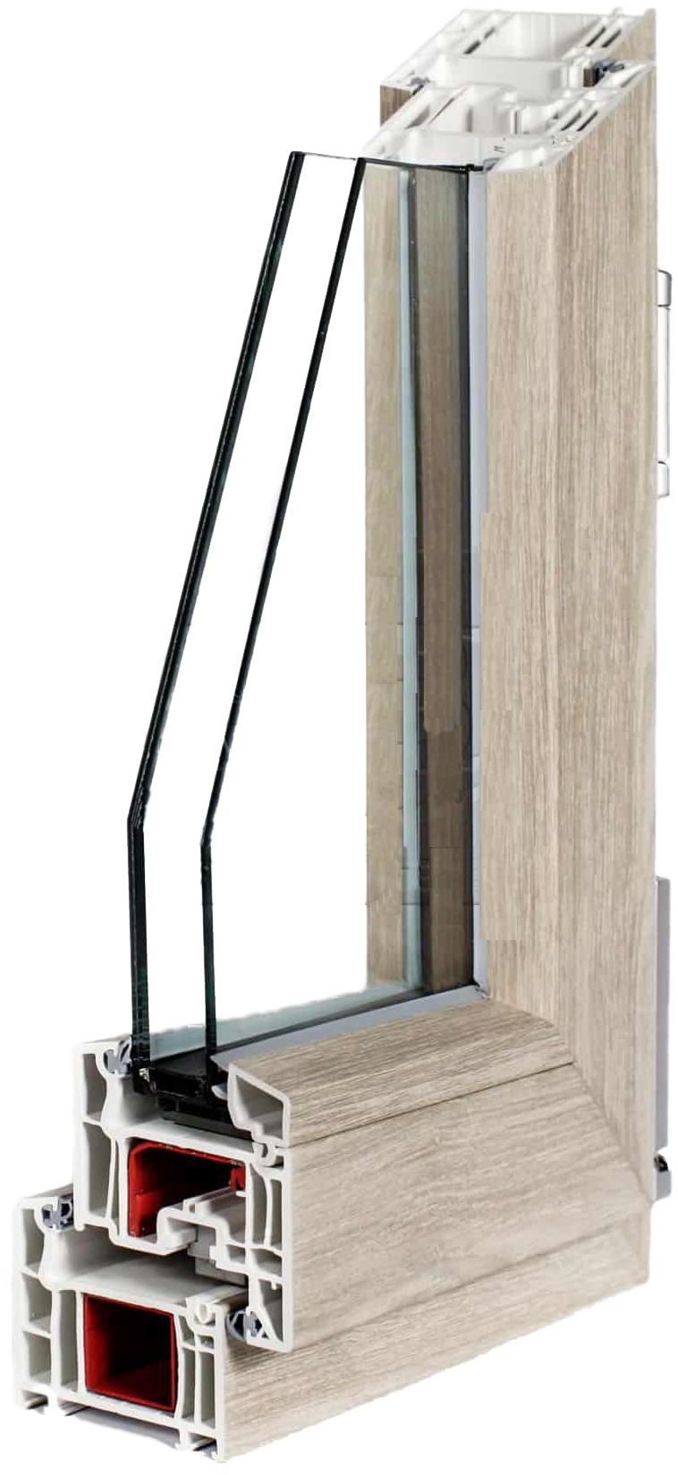 I profili hanno una profondità di 82 mm, avendo 7 camere d’isolamento nel telaio e 6 nell’anta; possono essere utilizzati sia per quanto riguarda le nuove costruzioni che in quelle di ristrutturazione. Il telaio e l’anta hanno un rinforzo perimetrale in acciaio zincato assicurando la stabilità dell’infisso ed anche un’ottima funzionalità a lungo tempo.